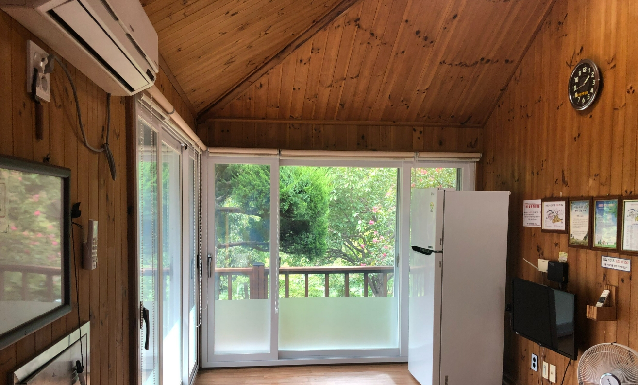 가족 단위, 연인 여행객에게 적합한 구조로, 방 1~2개와 주방, 욕실이 갖춰진 독채형 숙소입니다. 나무로 마감된 실내는 아늑하고, 창밖으로 보이는 숲이 인상적입니다.