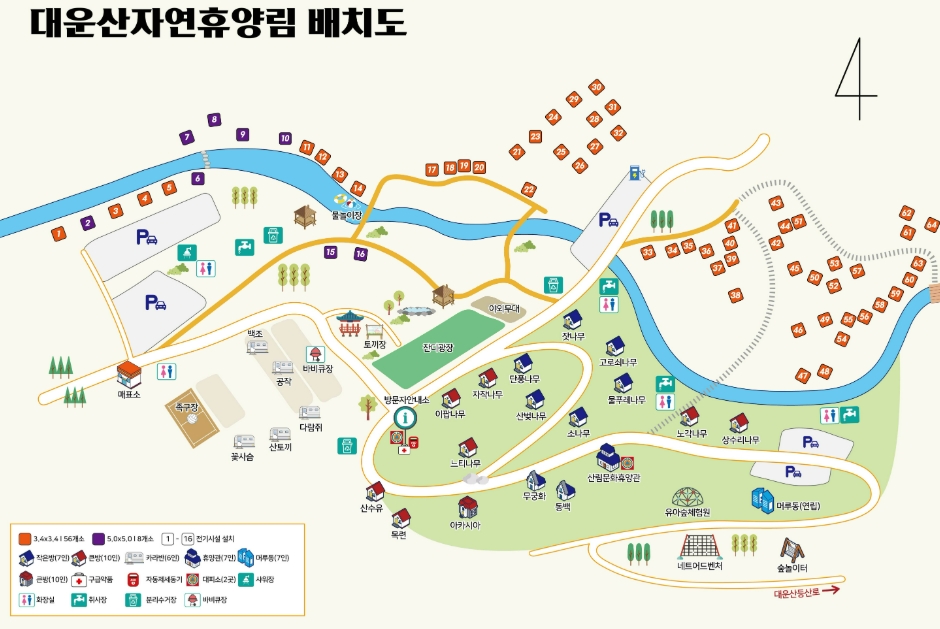 자연을 그대로 느끼고 싶은 분들에게 강력 추천! 나무 데크가 설치되어 있으며, 전기 사용 가능하고 깨끗한 화장실, 샤워장, 취사장이 준비되어 있어 캠핑 초보도 어렵지 않게 즐길 수 있습니다.